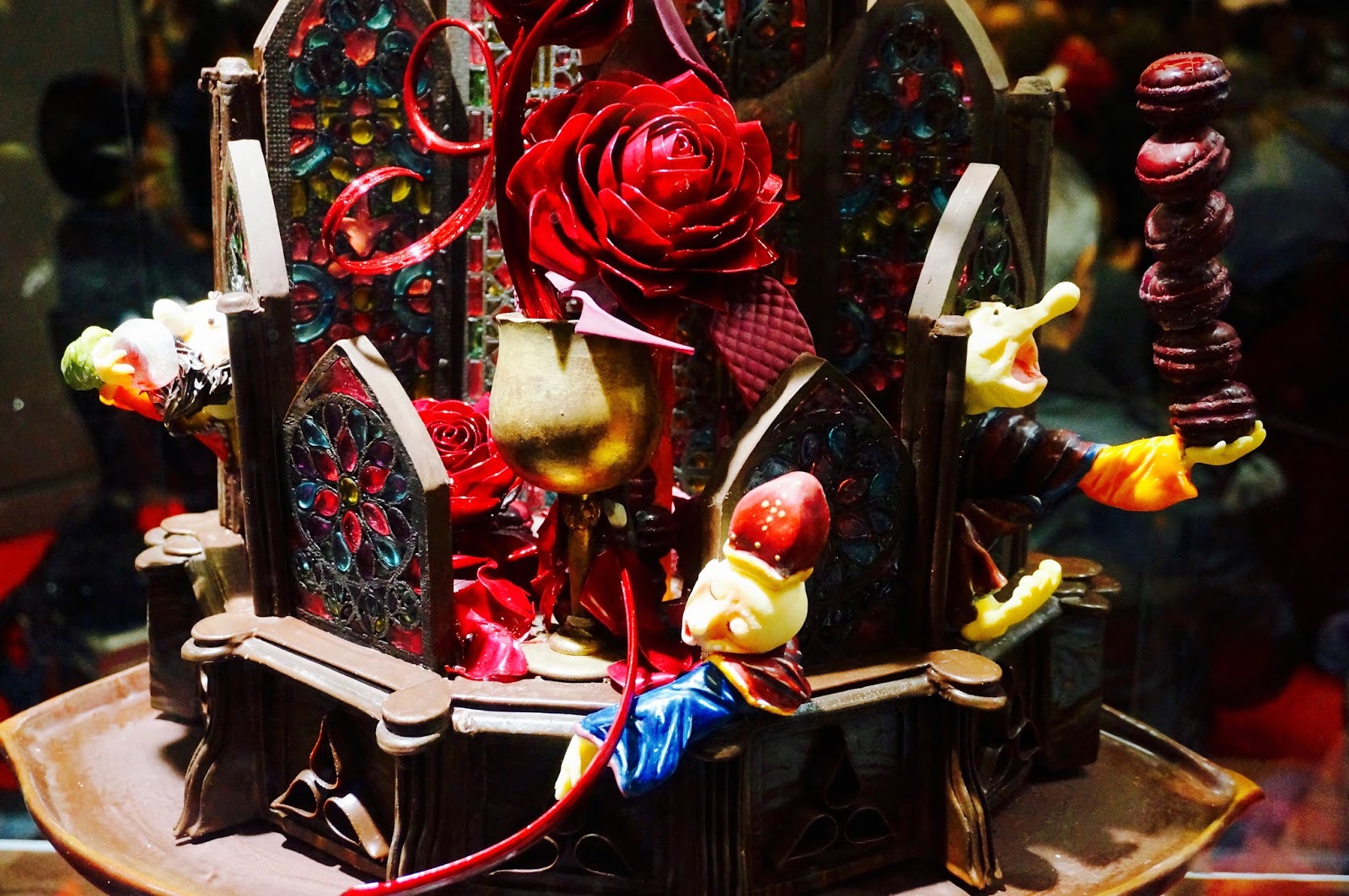 Contrairement à l'an dernier, les oeuvres artistiques en chocolat n'étaient pas aussi accessibles. Elles avaient été mises sous verre afin de bien les conserver et ne pas les abimer (dans mes souvenirs, il y avait eu beaucoup de casse l'an passé en particulier car les gens y touchaient). le concours artistique était celui du Relais Desserts Charles Proust. Le thème était "L'artisanat d'art, patrimoine français". J'ai été moins impressionnée par les réalisations, peut être était-ce le thème qui était moins inspirant, mais c'était tout de même magnifique.